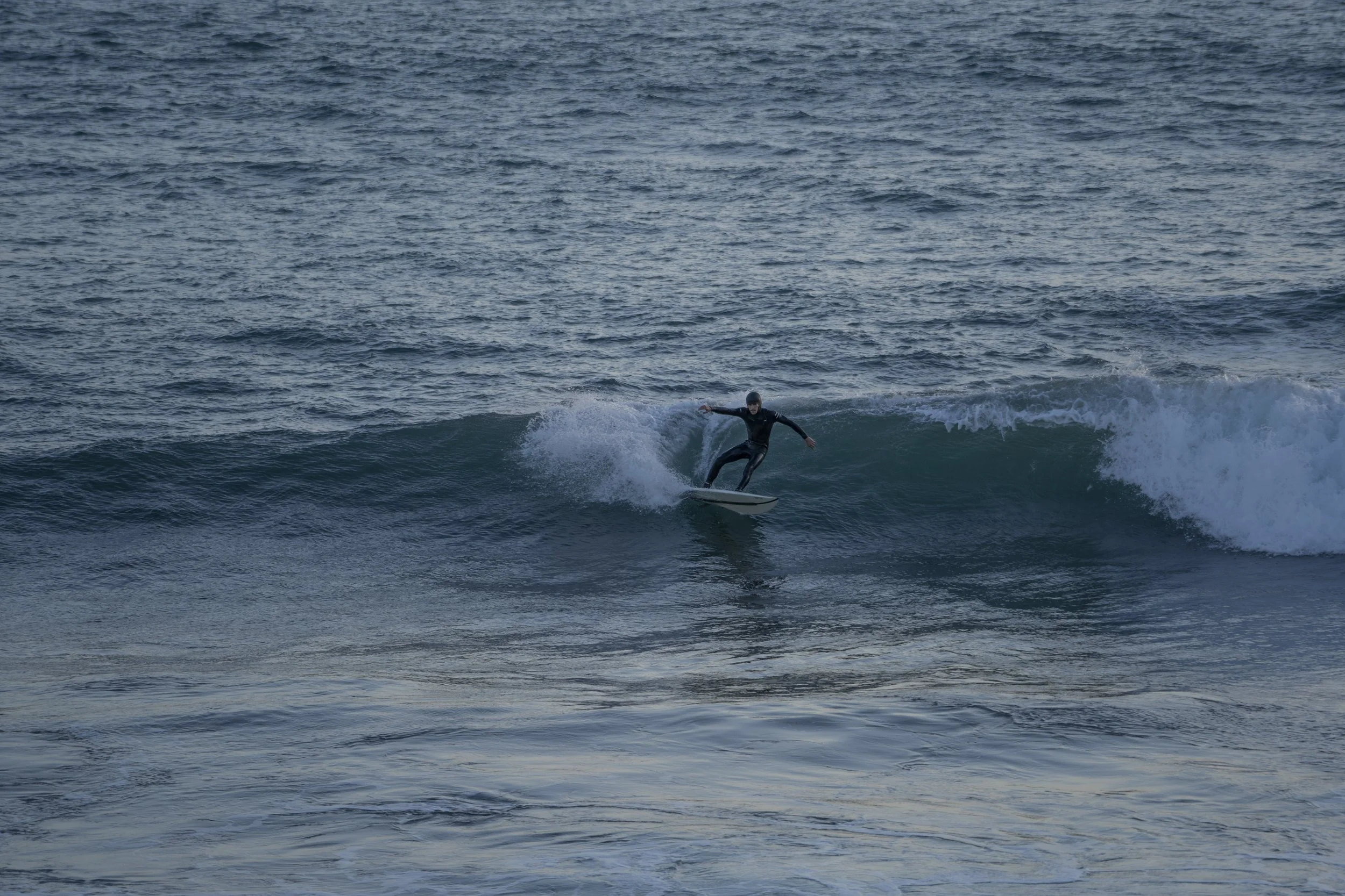 A surfer, finishing a turn on a wave, Porthleven, Cornwall, UK, 27th February 2022